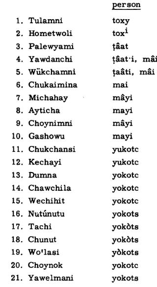 下の表は、Tachi族がその一つとして属するYokuts大部族の他の部族が「人」の意味で用いる単語のリストです。Kroeber(1961, p.187)から引用したこのリストは、5つの部族(1番~5番)が「人」という意味で、Tachiに近い発音を用いていることを示しています。また、興味深いことに、Yokuts大部族に属する21の部族のうち、11の部族(11番~21番)が「人」という意味でYokutsに近い発音を用いていることが分かります。